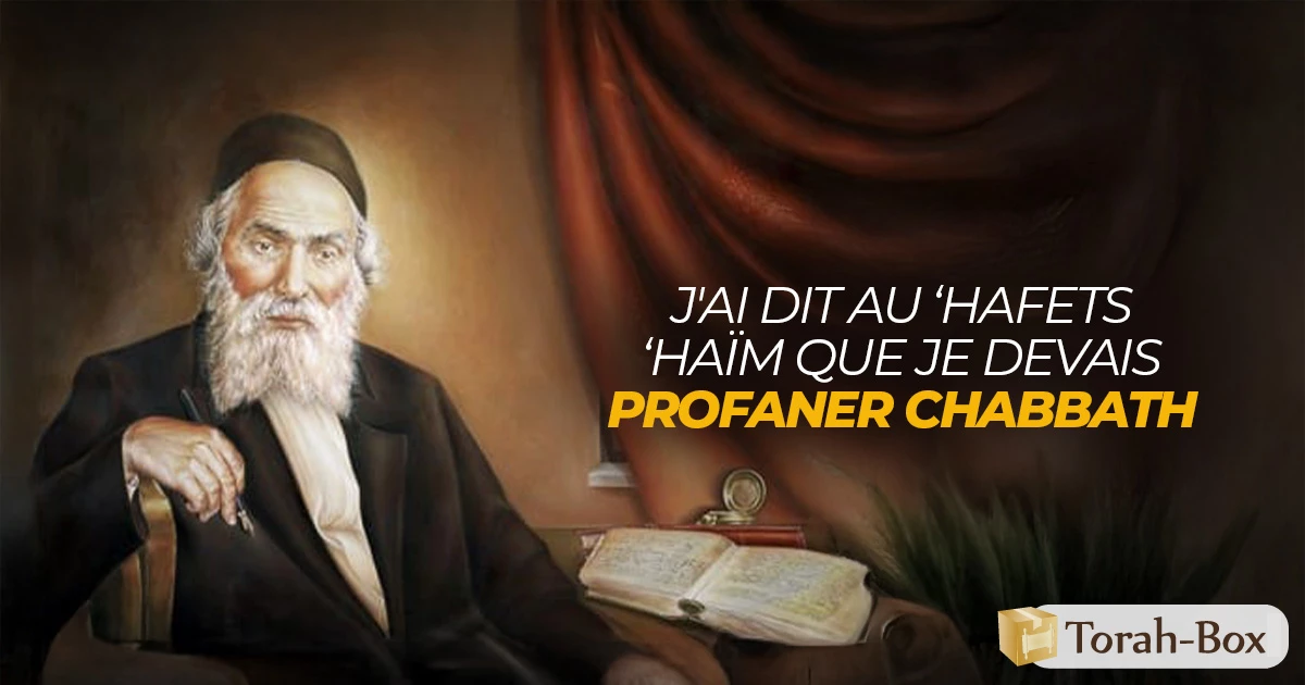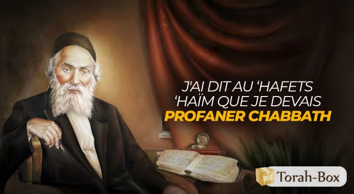 « J’ai malheureusement entendu des cas de Juifs qui le transgressent, et j’en ai rencontré plusieurs personnellement », relata le ‘Hafets ‘Haïm dont les larmes continuaient à inonder ses joues, « mais ton cas est plus complexe. Comprends-moi, j’ai été un bon ami de ton père, que son souvenir soit béni, et j’ai même participé à ta Brit-Mila. Je suis déjà âgé, il ne me reste plus beaucoup d’années à vivre dans ce monde-ci. Le jour s’approche où je rendrai l’âme à mon Créateur. J’arriverai au Ciel, et rencontrerai certainement ton père. Il me demandera : "Que se passe-t-il dans le monde ici-bas ? Comment va mon fils ?" Que pourrais-je lui répondre ? Je raconterais à mon ami proche que son fils profane le Chabbath ? Comment pourrais-je… C’est la raison de mes pleurs. »