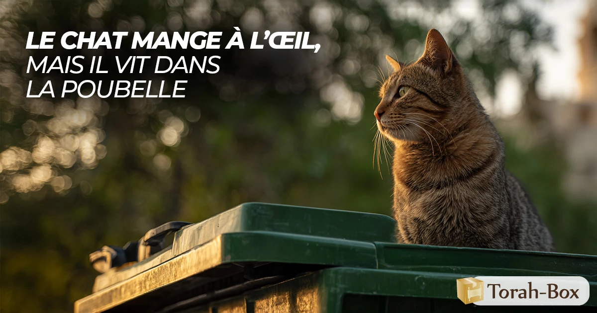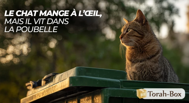 Les élèves comprirent alors pourquoi le Rav avait décidé d’évoquer les pensées du chat. Ils en retirèrent une leçon capitale. Souvent, l’homme se trouve dans un état spirituel faible, éloigné de la Torah, du Chabbath et du respect des Mitsvot. Il se sent bien tel quel, cette situation lui convient bien. Mais il ne comprend pas que s’il émergeait un instant des ordures, s’habituait à maintenir un niveau d’hygiène spirituelle de base, à préserver quelque peu son regard, à éviter de profaner le Chabbath et de proférer des propos médisants, etc., il comprendrait à quel point il se trouve à présent dans les détritus. À quel point les scènes qui à présent le tentent, sont horribles et détestables, à quel point son Chabbath est misérable lorsqu’il le passe en regardant la télévision, plutôt que de s’imbiber d’un peu de spiritualité pour nourrir l’âme divine qui se trouve en lui.