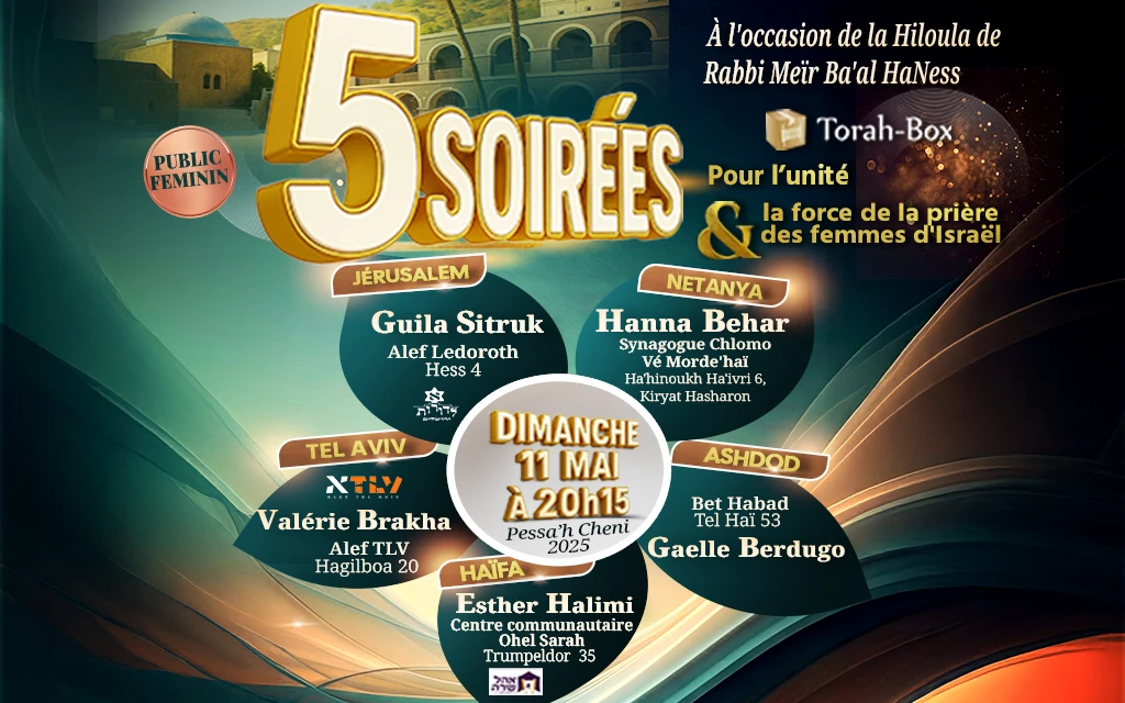 5 soirées féminines - Dimanche 11 mai à 20h15, à l'occasion de la Hiloula de Rabbi Meir Ba'al HaNess et Pessa'h Cheni.