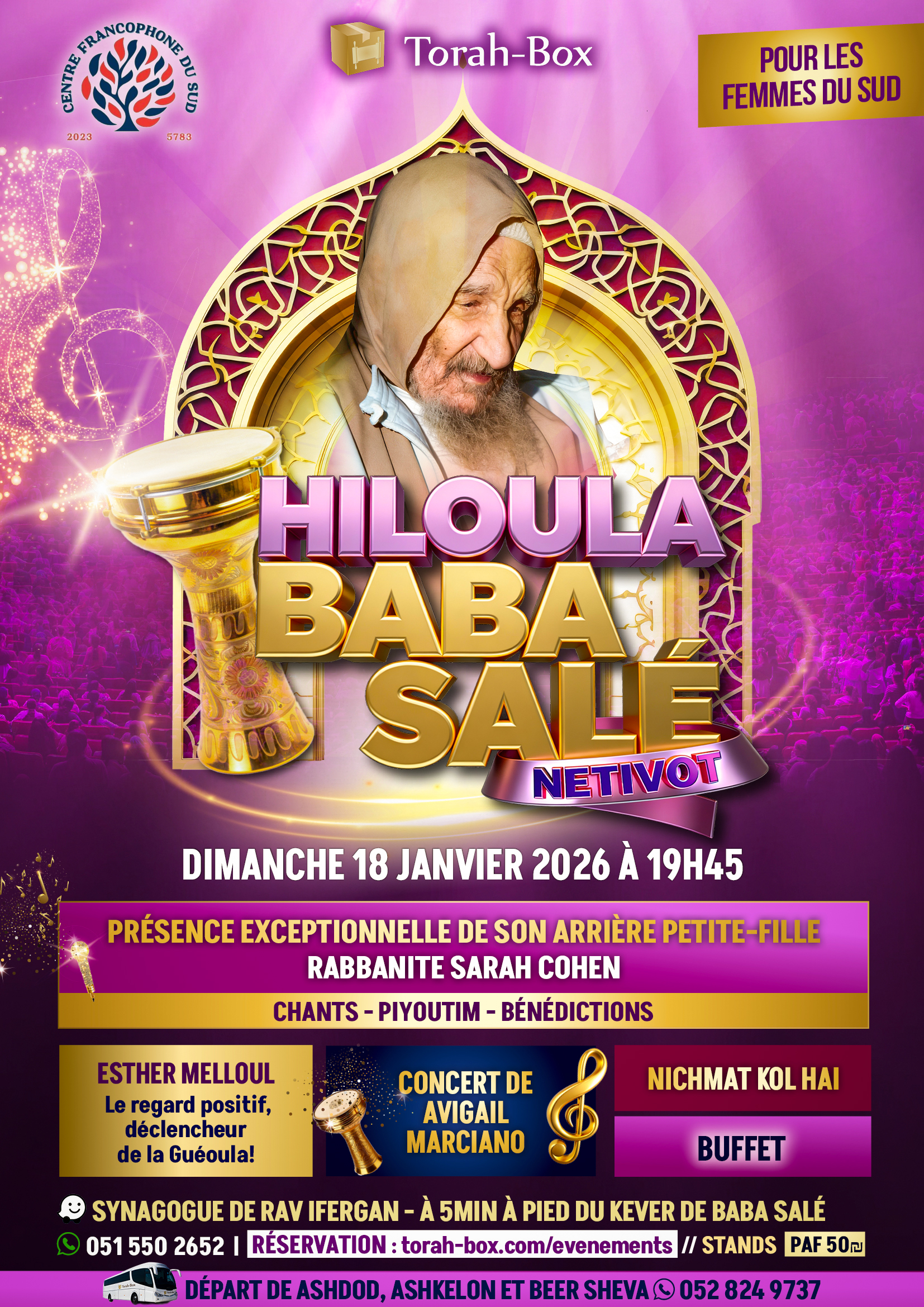 Pour que son mérite soit sur vous toutes et sur tout le Am Israel, un programme unique et inspirant vous attend avec la présence exceptionnelle de la Rabbanite Sarah Cohen, arrière-petite-fille du Baba Salé, qui partagera des enseignements, récits et bénédictions transmis de génération en génération.