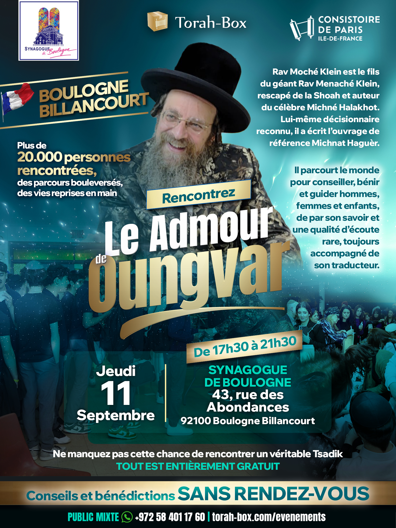 Durant cette semaine, le Admour visitera plusieurs communautés : Boulogne, Paris, Enghien, Suresnes, Neuilly, Charenton, Maisons-Alfort, Neuilly/Marne.