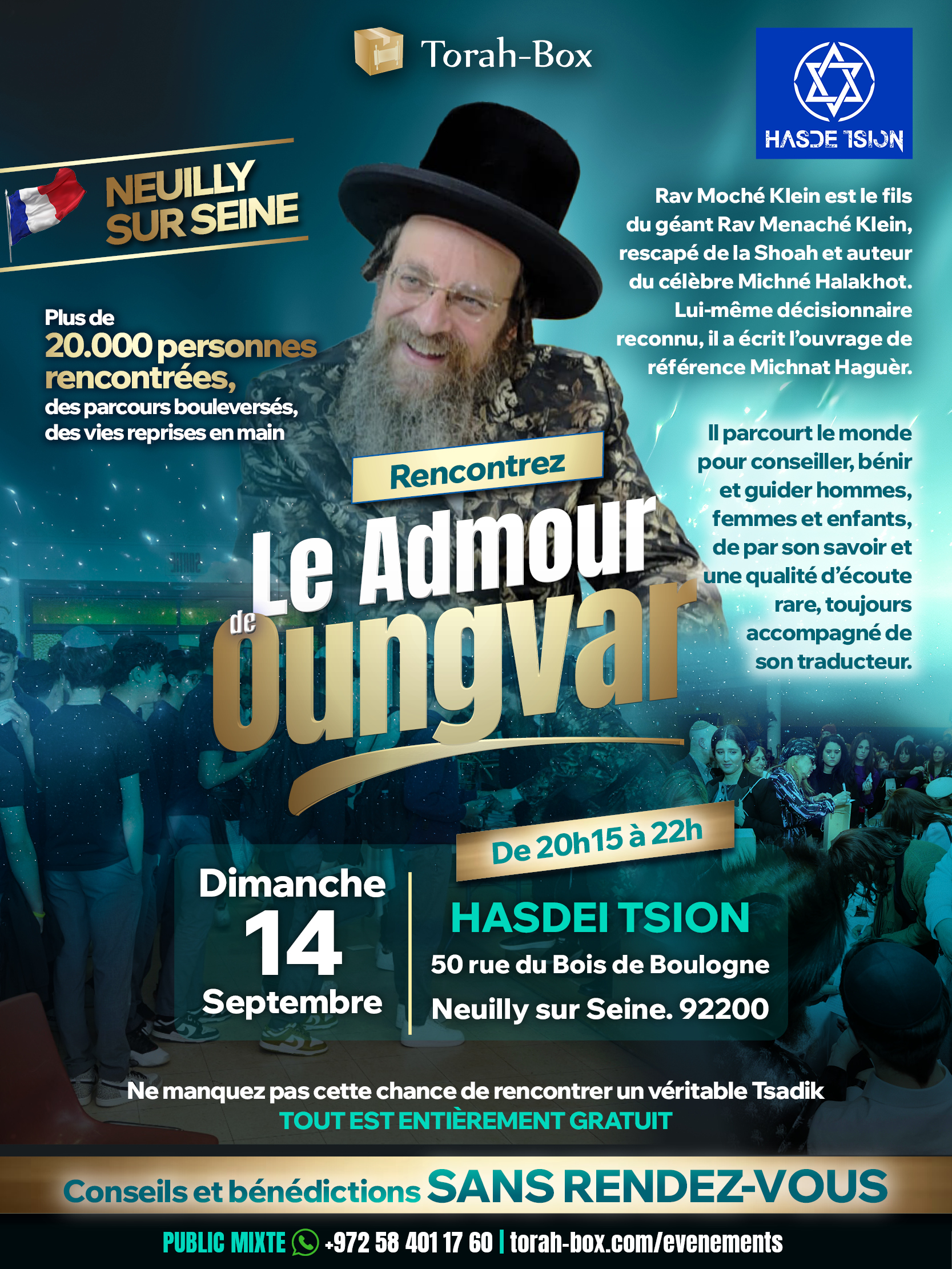 Reconnu à travers le monde pour son écoute, sa sagesse et la force de ses bénédictions, le Admour a déjà marqué la vie de plus de 20.000 personnes. Son dernier passage à Paris avait laissé une empreinte inoubliable, et nombreux sont ceux qui attendaient impatiemment sa prochaine venue.