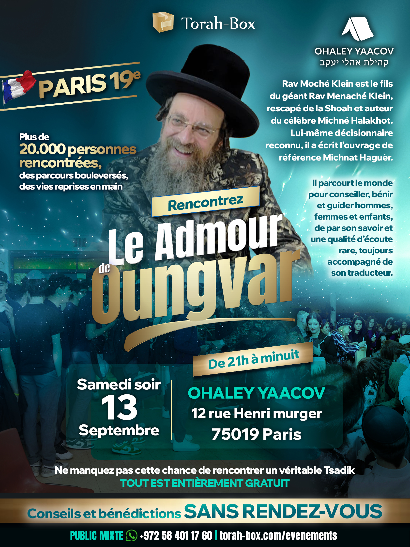 Reconnu à travers le monde pour son écoute, sa sagesse et la force de ses bénédictions, le Admour a déjà marqué la vie de plus de 20.000 personnes. Son dernier passage à Paris avait laissé une empreinte inoubliable, et nombreux sont ceux qui attendaient impatiemment sa prochaine venue.