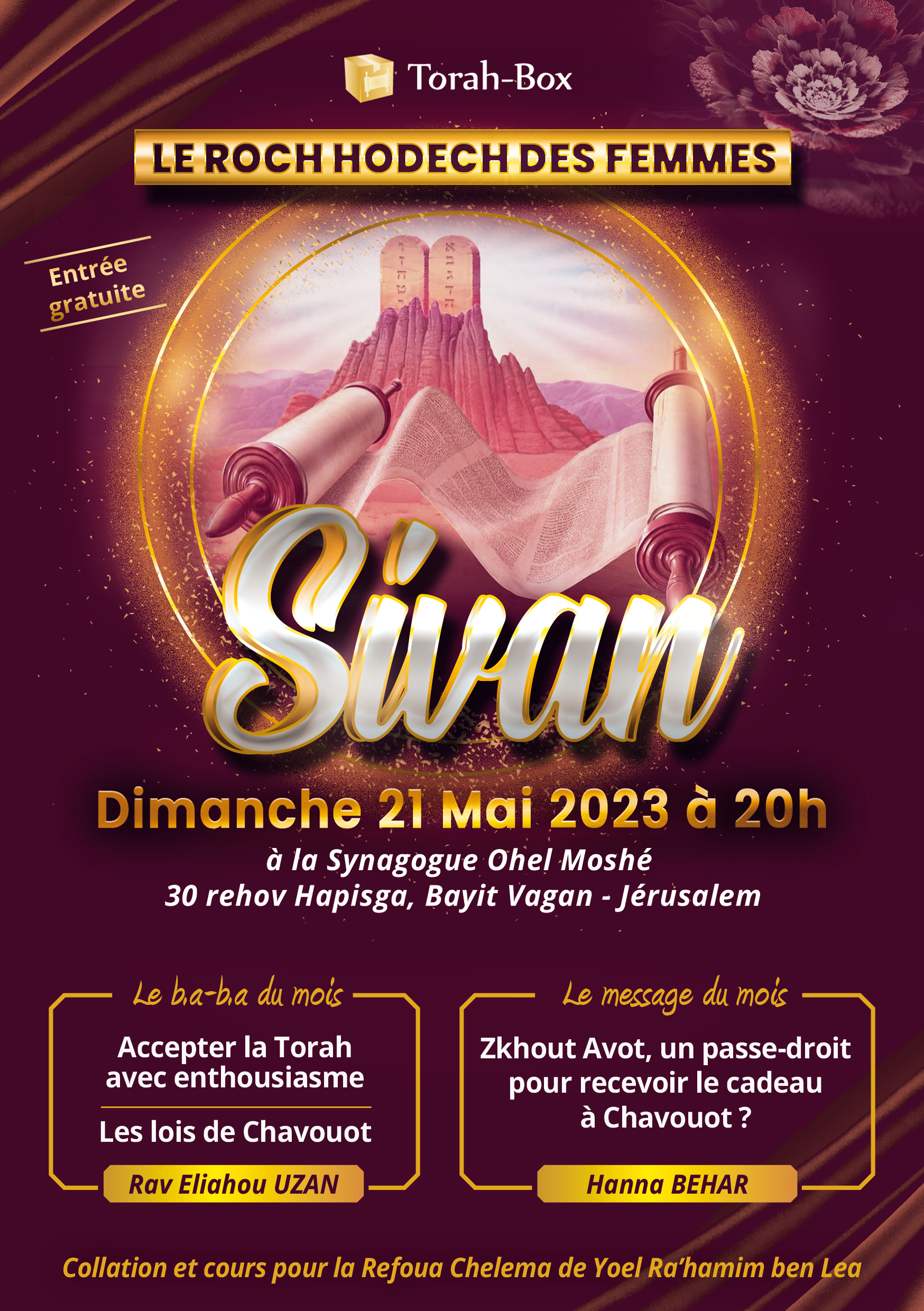 L’entrée est gratuite et une collation est offerte. Venez nombreuses pour démarrer le mois béni de Sivan dans les meilleures dispositions !