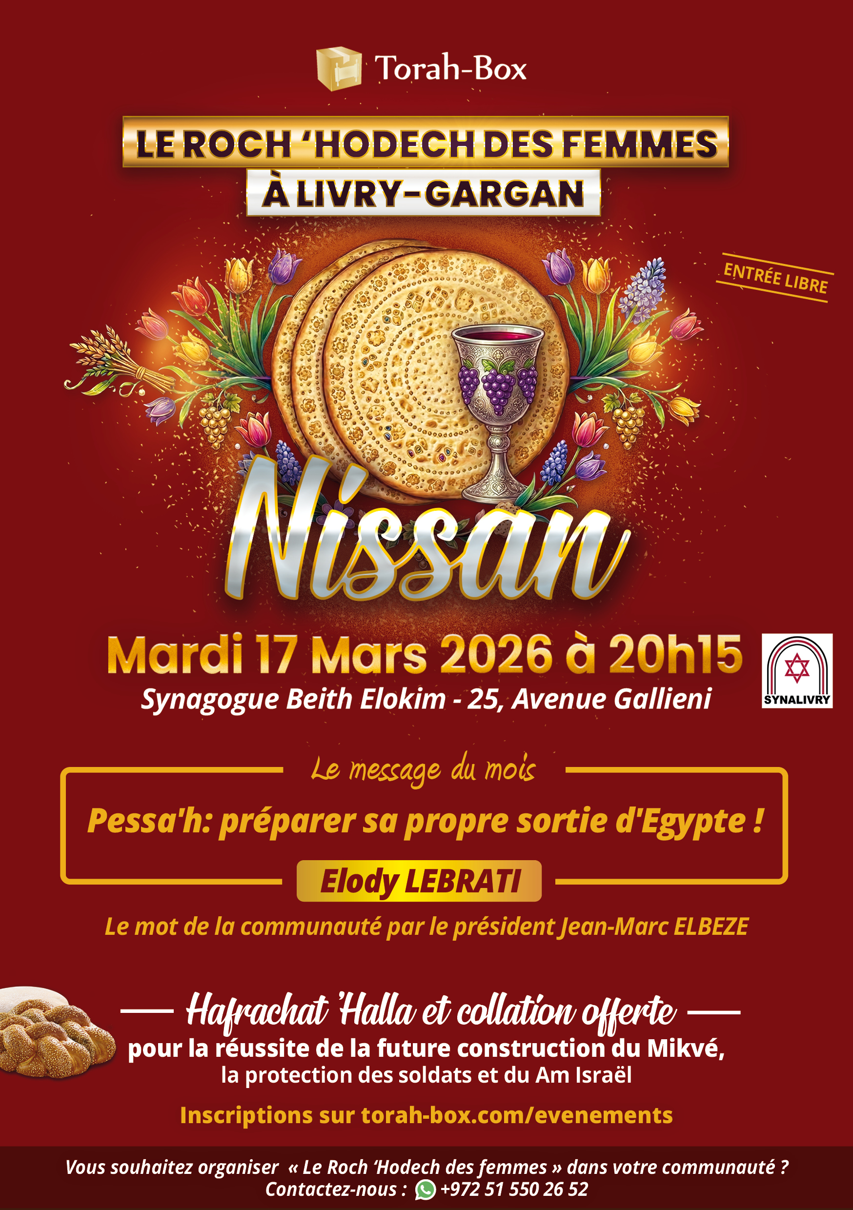 - Hafrachat ‘Halla – un moment fort de prière et de bénédictions, accompagné d’une collation offerte.