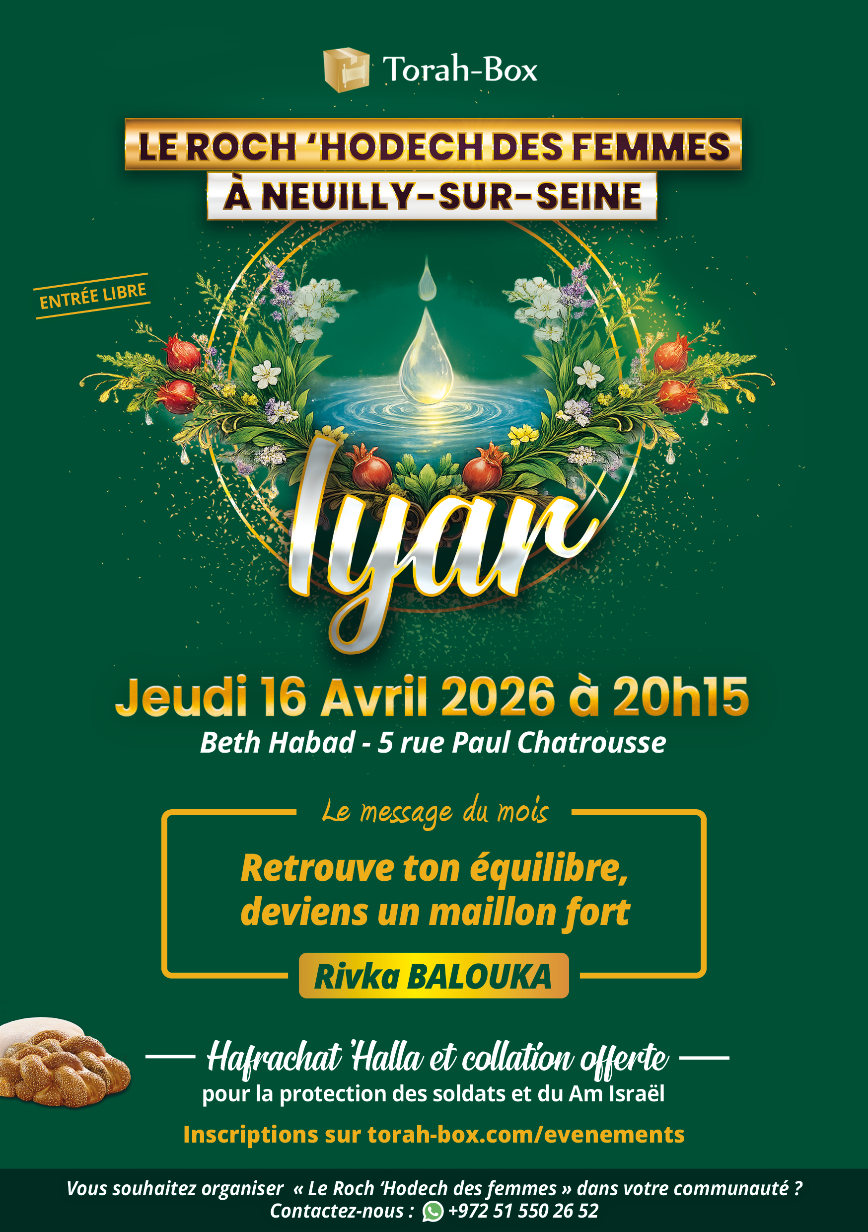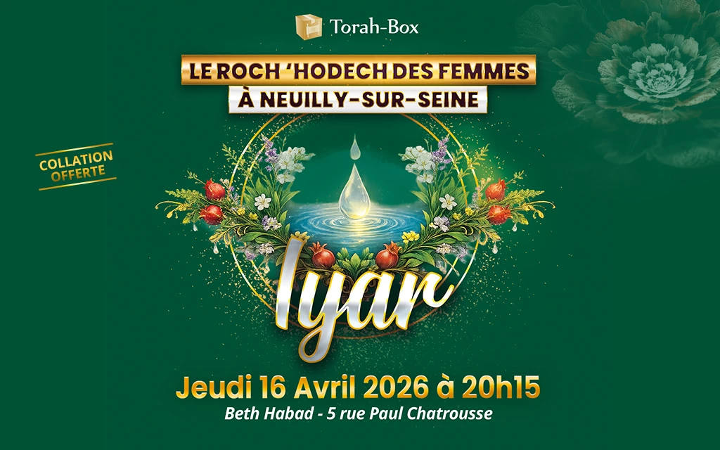 À l’occasion du mois de Iyar, symbole de guérison et d’équilibre intérieur, Torah-Box vous invite à une soirée inspirante et pleine de sens, le Jeudi 16 avril 2026 à 20h15, à Neuilly sur Seine.