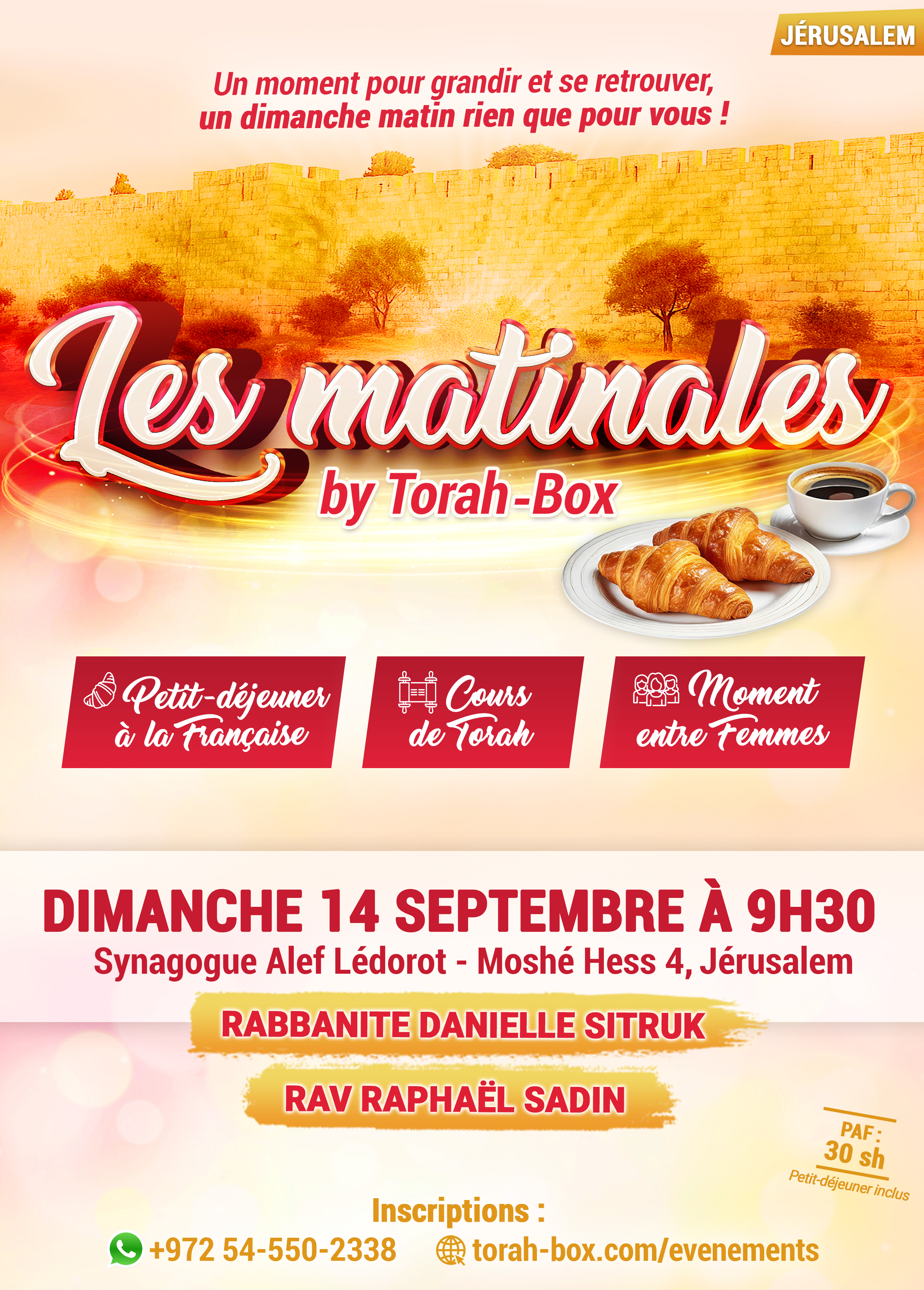 Ce dimanche 14 septembre à 9h30, Torah-Box vous invite à vivre une matinée unique dédiée aux femmes, à la Synagogue Alef Lédorot, à deux pas de Mamilla au cœur de Jérusalem.
