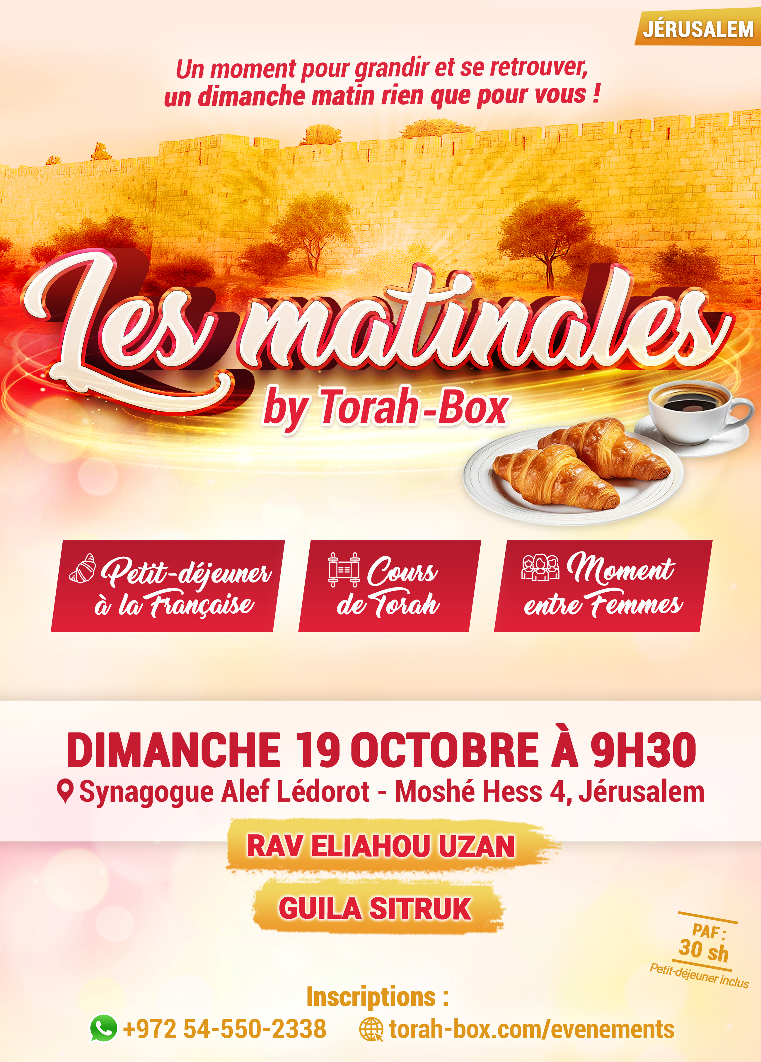 Ce dimanche 19 Octobre à 9h30, Torah-Box vous convie à une nouvelle édition des Matinales, un moment unique entre femmes, au cœur de Jérusalem – à deux pas de Mamilla.
