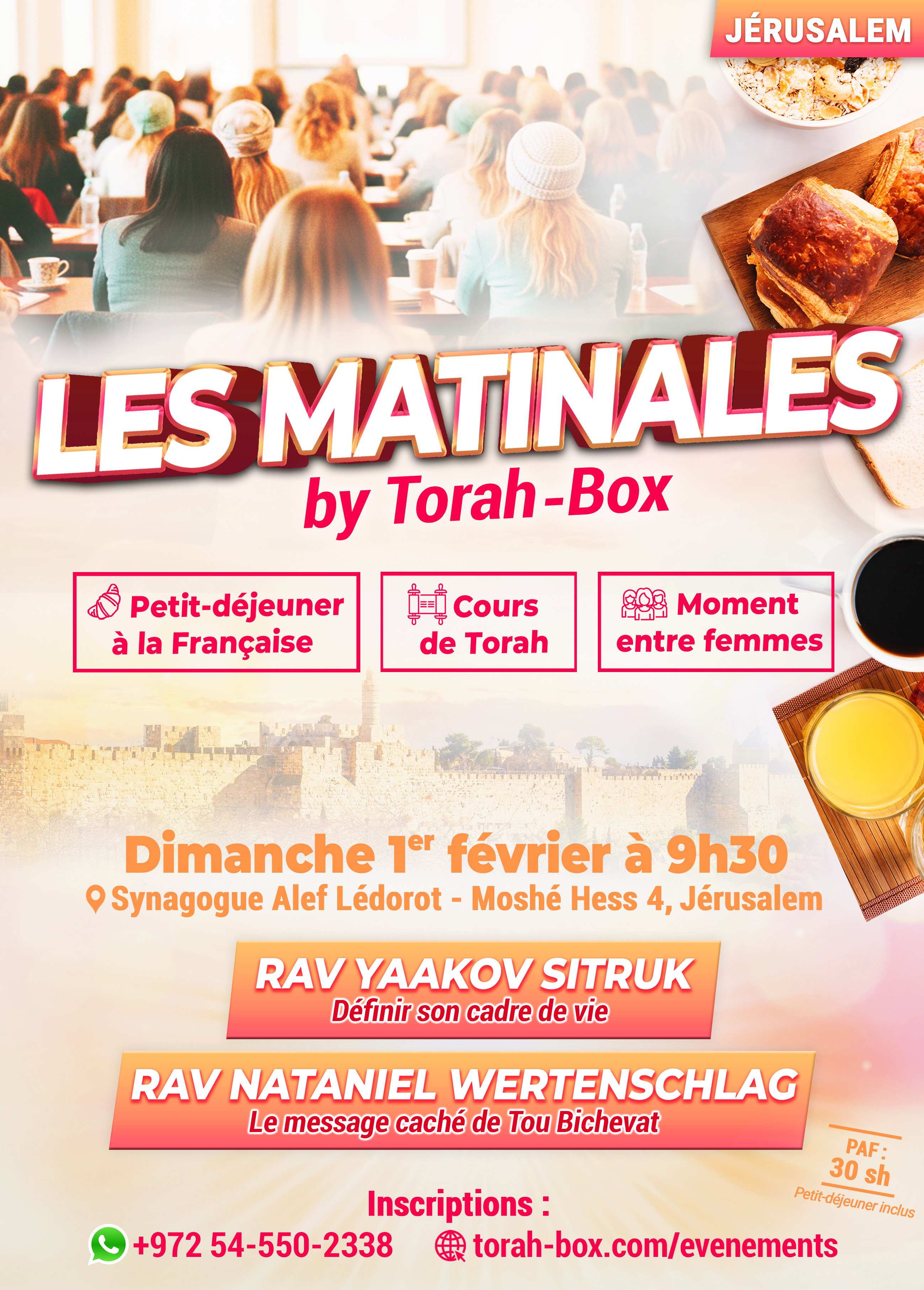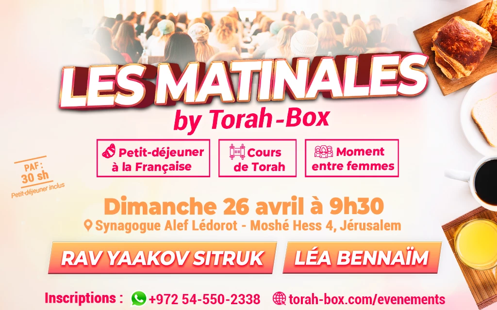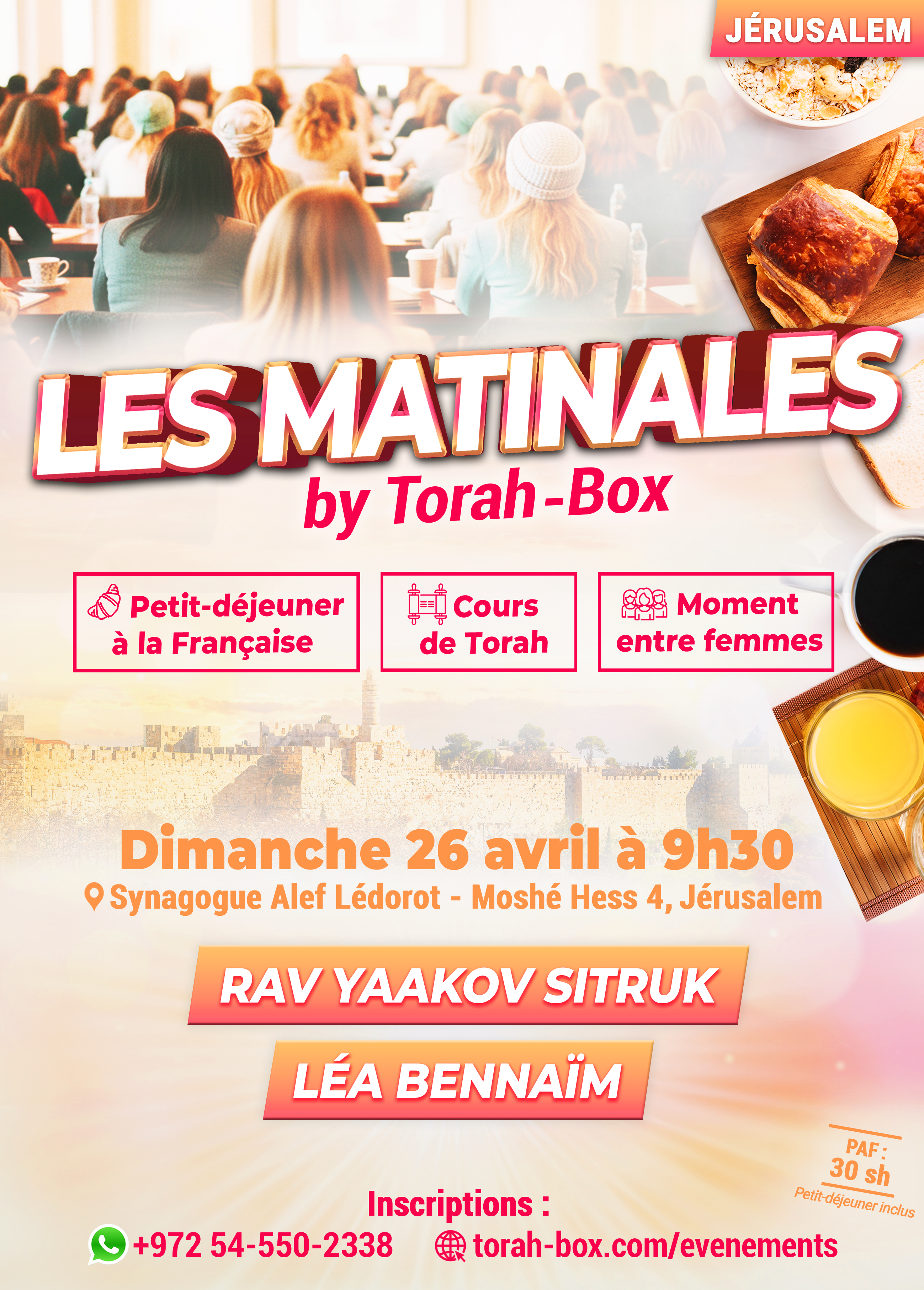 Les dimanches à 9h30, Torah-Box vous convie à une nouvelle édition des Matinales, un moment unique entre femmes, au cœur de Jérusalem – à deux pas de Mamilla.