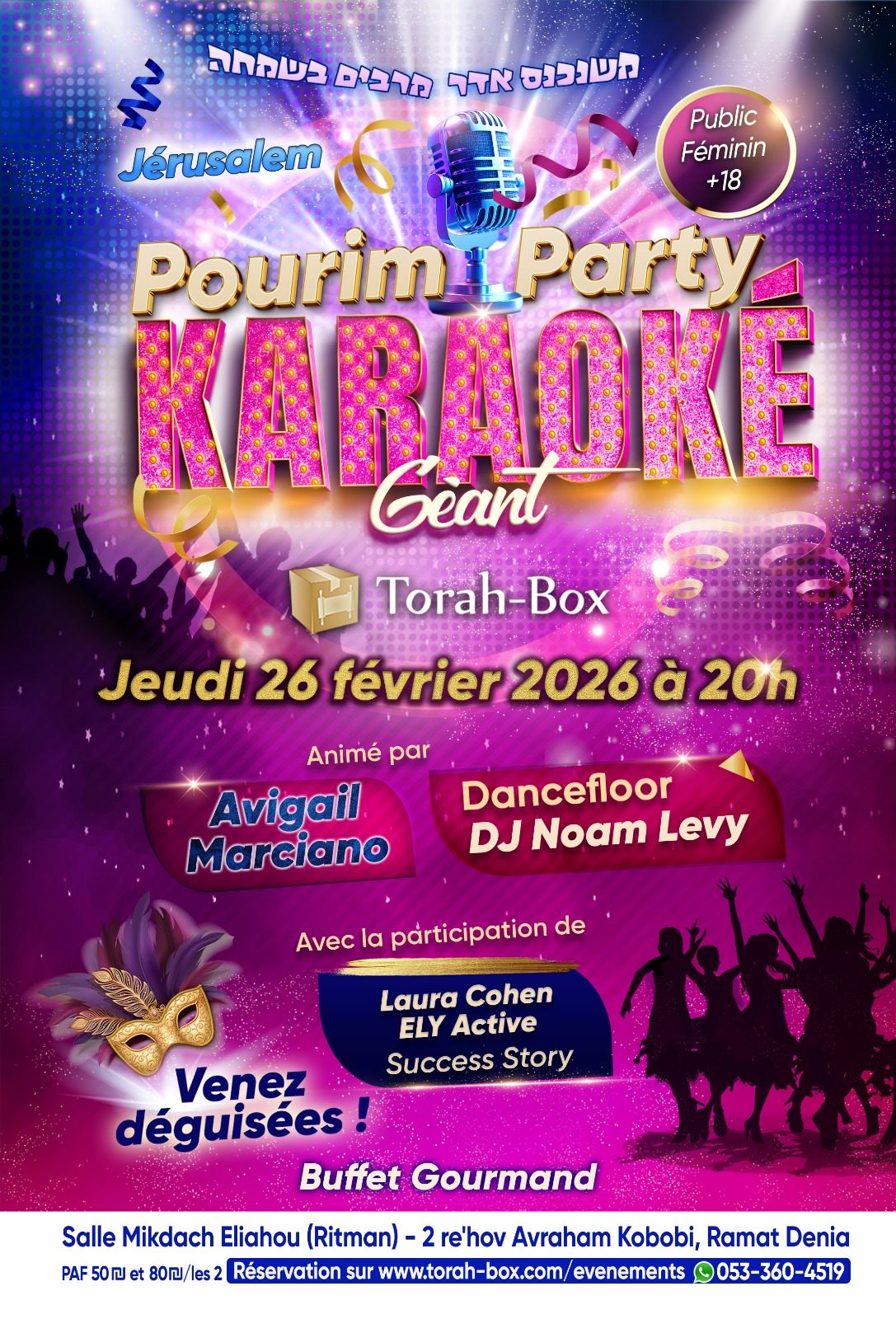 Le jeudi 26 fevrier 2026 à 20h, Torah-Box vous invite à une soirée féminine, Pourim Party Karaoké Géant à Jérusalem, un événement placé sous le signe de la joie.