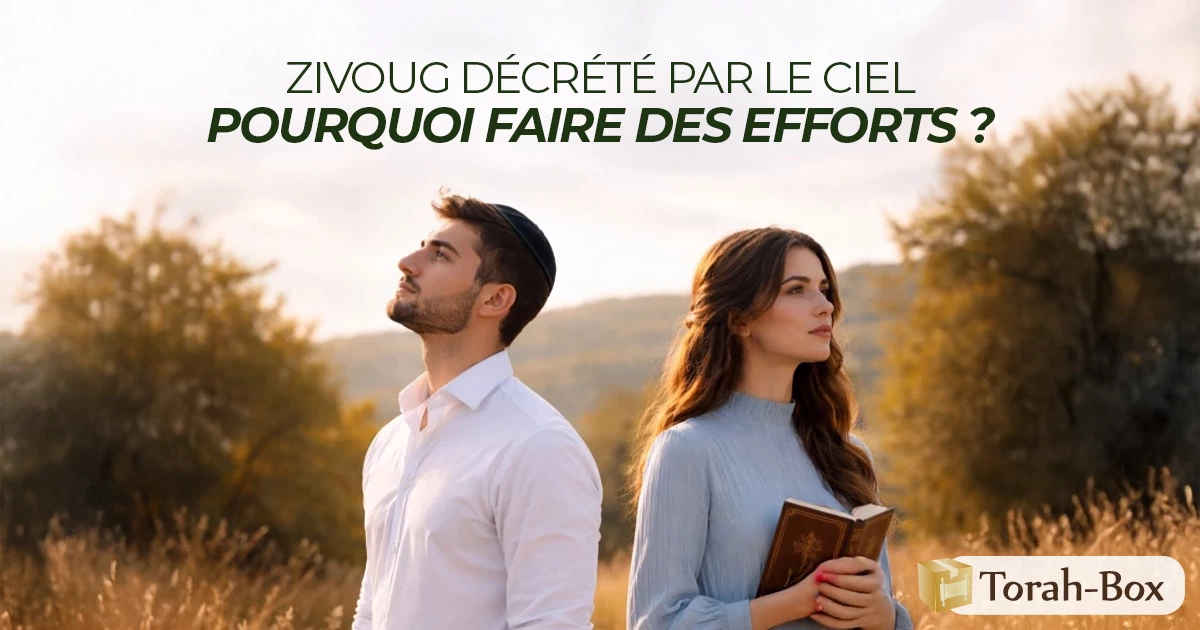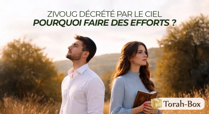 Question : “Si mon Zivoug (âme soeur) est déterminé par le Ciel, quel effort et quelle vigilance sont réellement attendus de moi durant la période des Chiddoukhim (rencontres en vue d’un mariage) ? Car comme le disent nos Sages : « Quarante jours avant la formation de l’embryon, une voix céleste sort et proclame : la fille d’Untel est destinée à Untel » (Sotah 2b). Si c’est ainsi, pourquoi faudrait-il faire des efforts ? Après tout, ce qui est à moi est à moi, et ce qui m’est destiné arrivera jusqu’à moi !”