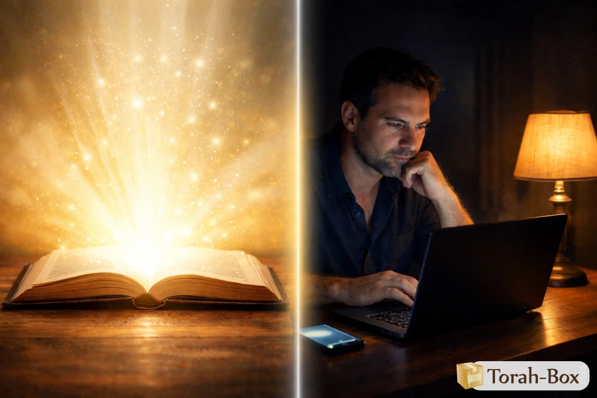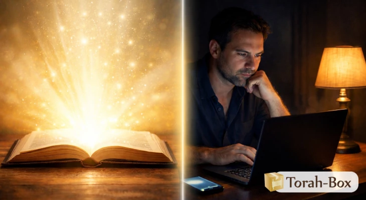 Ici, il faut souligner qu’il ne s’agit pas, dans l’analyse précédente, d’une comparaison entre la « lumière » grecque et la lumière de la Torah. Le but, ici, est de dénoncer les dangers, plus évidents que jamais en cette époque sophistiquée, dangers de l’éclairage artificiel que le progrès allume. L’obscurité, c’est de n’avoir aucune référence, aucune relation à la transcendance. Notre époque est obscure, car l’on ne reconnaît pas la vraie lumière. Plus que jamais, l’objet remplace l’homme. La machine règle le monde. Il ne s’agit plus seulement de télévision, mais chacun peut voir dans son téléphone privé les images les plus séduisantes. On ne vit pas aujourd’hui sans un petit ordinateur qui nous accompagne. Est-ce cela la lumière ? Certes, il y a des avantages : l’ordinateur permet d’écrire des « Divré Torah ». L’imprimerie avait produit la même révolution, mais ce qui est dangereux, c’est d’être soumis à des éléments qui veulent guider la vie des hommes. L’obscurité, c’est de donner à ces forces une valeur, c’est de ne plus pouvoir vivre sans un ordinateur dans la poche. C’est pratique, mais est-ce cela la lumière ?