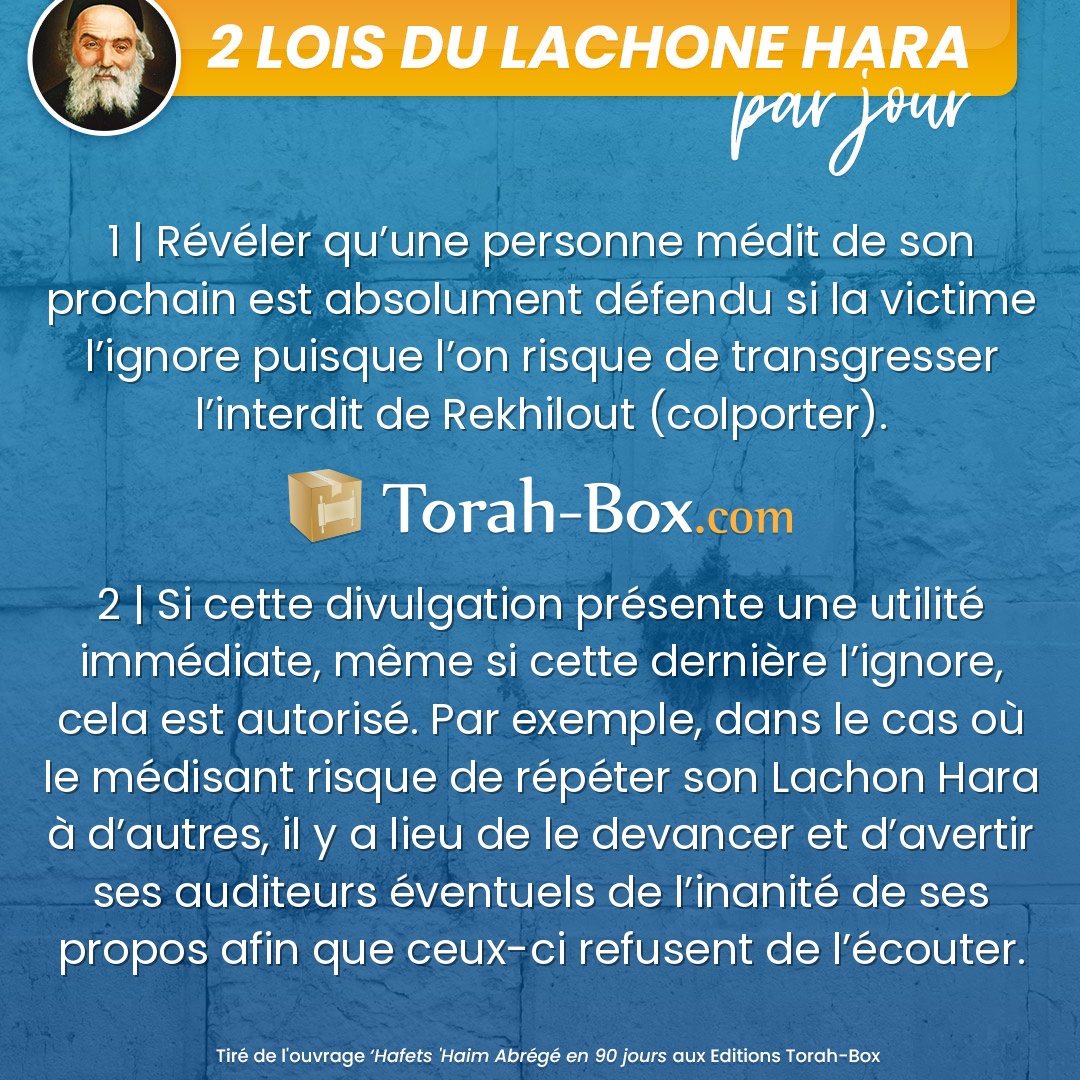 A la demande du Rav Kanievsky d'étudier chaque jour 2 Halakhot du Lachone Hara pour nous protéger, l'équipe Torah-Box vous propose chaque jour une belle image avec 2 lois du langage.