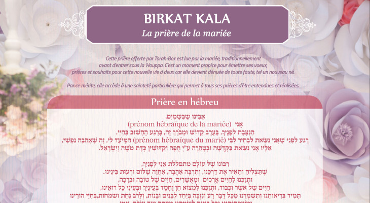 Il existe une jolie prière lue par la mariée traditionnellement avant d'entrer sous la 'Houppa, car c'est un moment propice pour émettre ses souhaits pour cette nouvelle vie à deux car les mariés deviennent dénués de toute faute, tel un nouveau-né. Par ce mérite, ils accèdent à une sainteté particulière qui permet à toutes les prières de la mariée d'être entendues et réalisées.