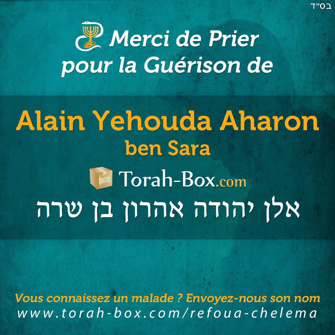 Nos Sages ont enseigné que la Téfila (prière), la Téchouva (repentir) et la Tsédaka (charité) permettent d'annuler un décret divin. Afin de contribuer à la guérison complète de Alain Yehouda Aharon, ses proches et ses amis sont invités à agir pour lui.