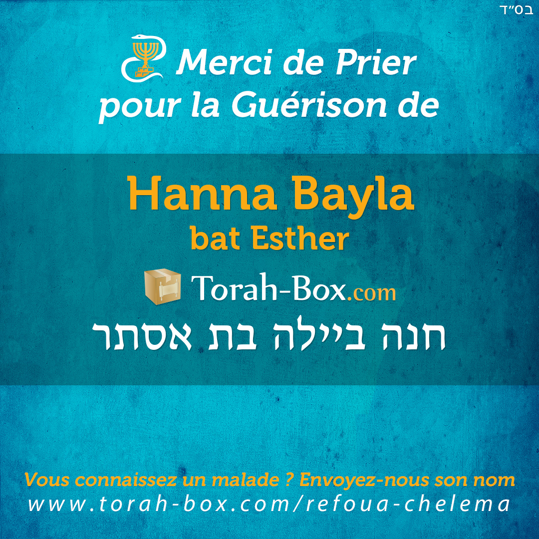 Nos Sages ont enseigné que la Téfila (prière), la Téchouva (repentir) et la Tsédaka (charité) permettent d'annuler un décret divin. Afin de contribuer à la guérison complète de Hanna Bayla, ses proches et ses amis sont invités à agir pour lui.