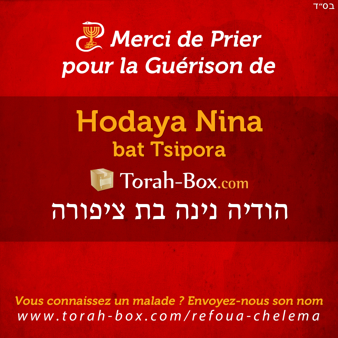 Nos Sages ont enseigné que la Téfila (prière), la Téchouva (repentir) et la Tsédaka (charité) permettent d'annuler un décret divin. Afin de contribuer à la guérison complète de Hodaya Nina, ses proches et ses amis sont invités à agir pour lui.