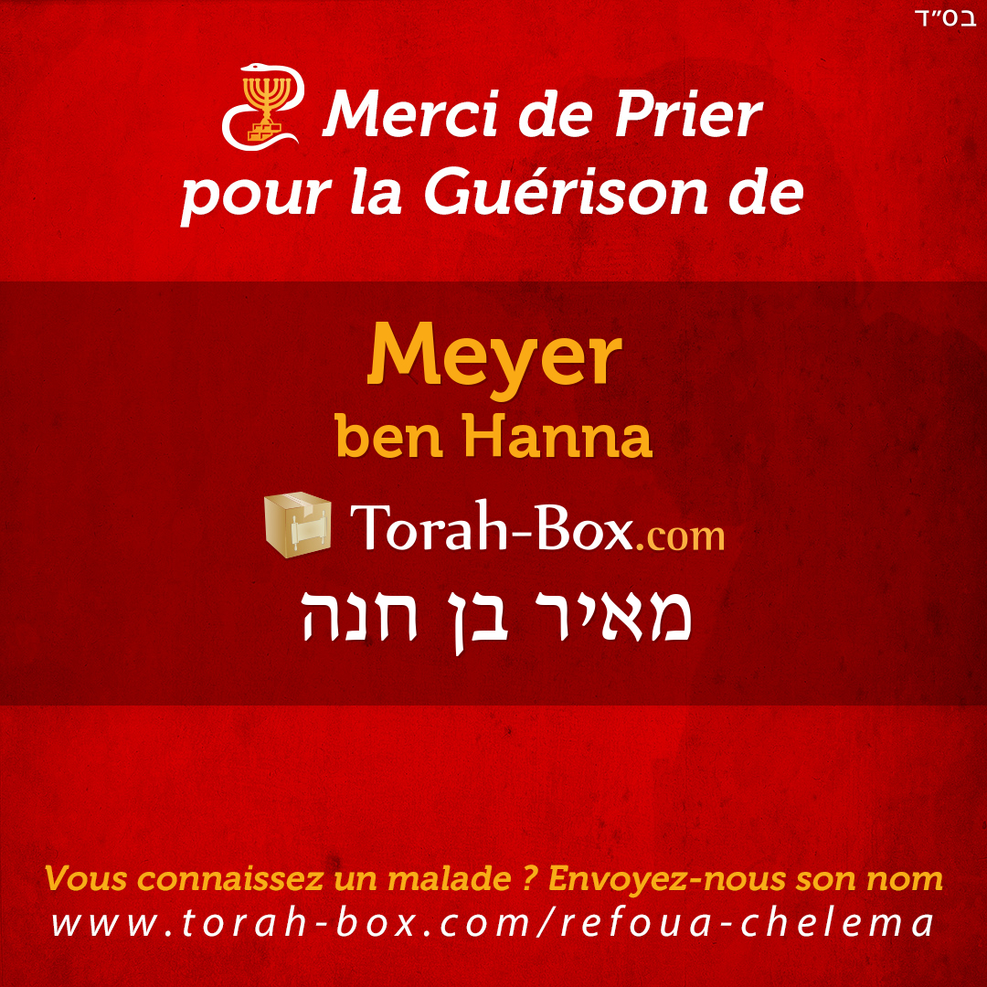 Nos Sages ont enseigné que la Téfila (prière), la Téchouva (repentir) et la Tsédaka (charité) permettent d'annuler un décret divin. Afin de contribuer à la guérison complète de Meyer, ses proches et ses amis sont invités à agir pour lui.