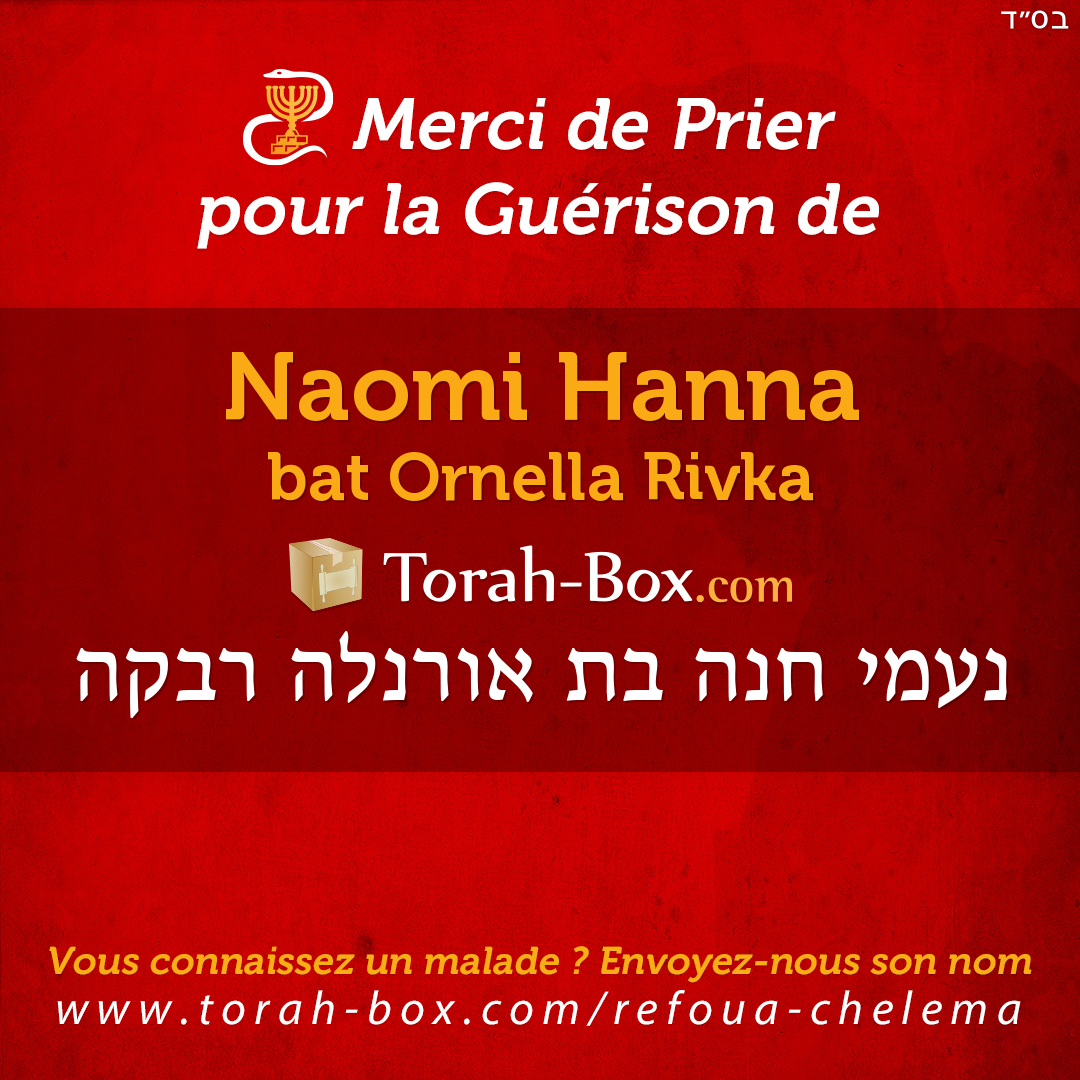Nos Sages ont enseigné que la Téfila (prière), la Téchouva (repentir) et la Tsédaka (charité) permettent d'annuler un décret divin. Afin de contribuer à la guérison complète de Naomi Hanna, ses proches et ses amis sont invités à agir pour lui.