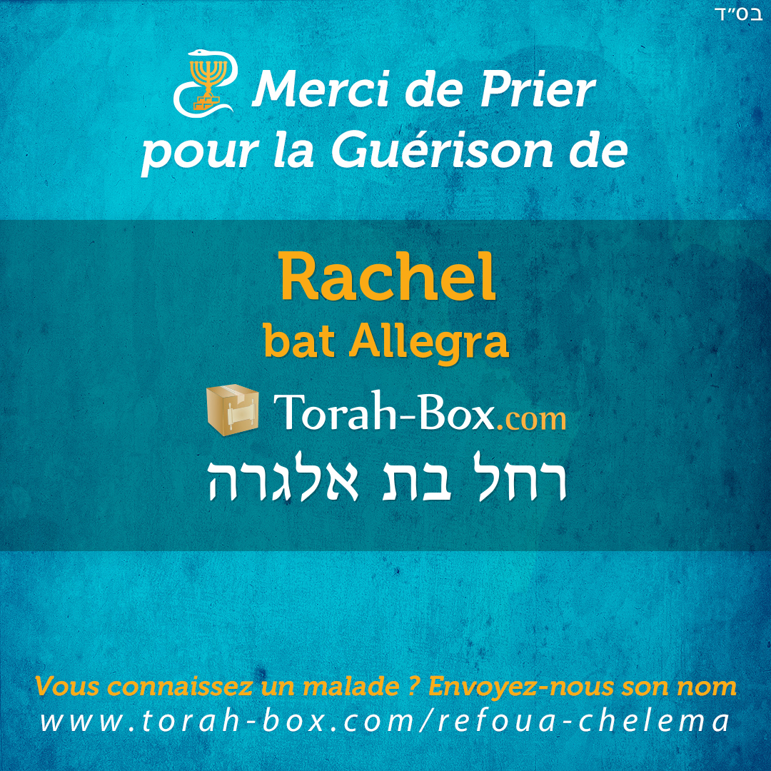 Nos Sages ont enseigné que la Téfila (prière), la Téchouva (repentir) et la Tsédaka (charité) permettent d'annuler un décret divin. Afin de contribuer à la guérison complète de Rachel, ses proches et ses amis sont invités à agir pour lui.