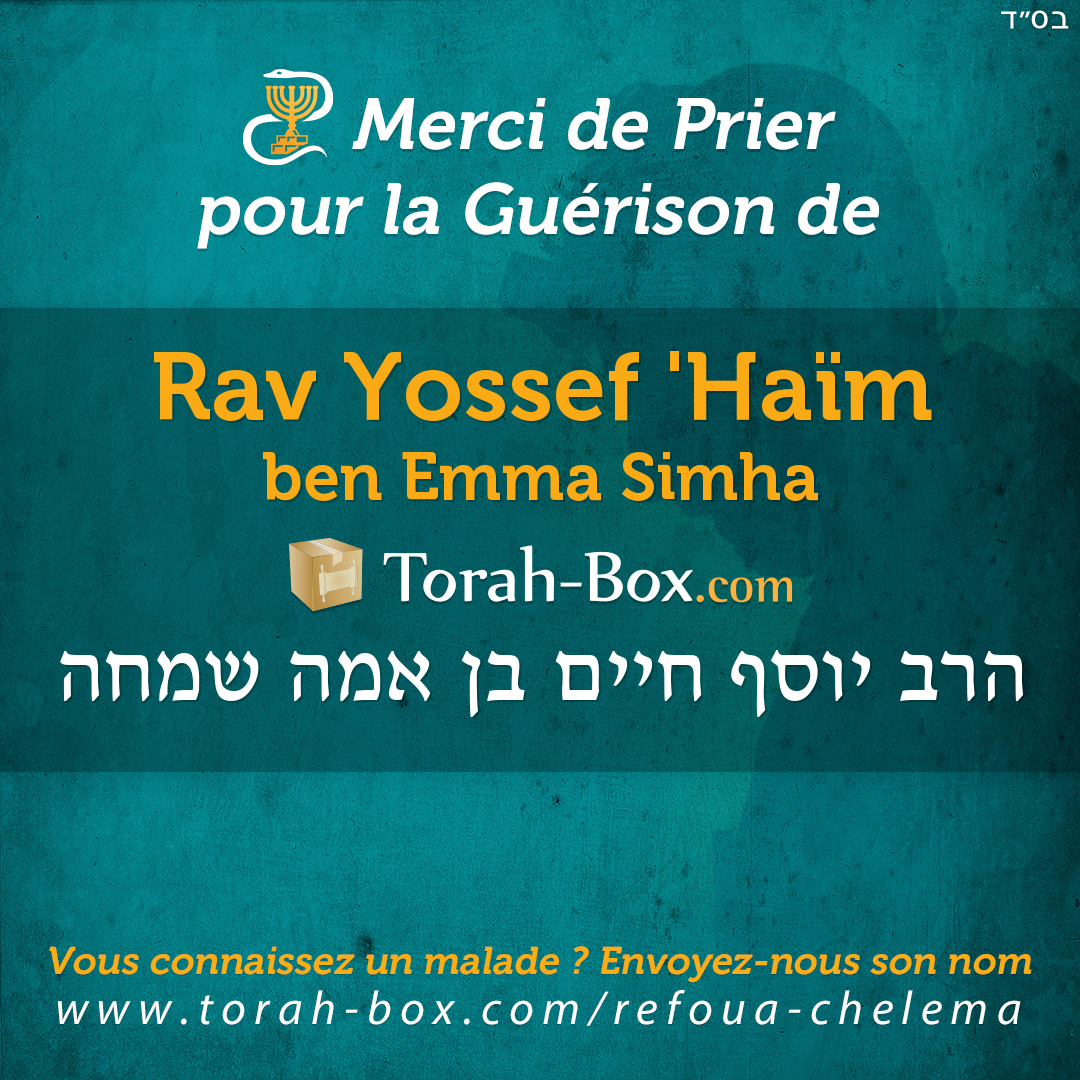 Nos Sages ont enseigné que la Téfila (prière), la Téchouva (repentir) et la Tsédaka (charité) permettent d'annuler un décret divin. Afin de contribuer à la guérison complète de Rav Yossef 'Haïm, ses proches et ses amis sont invités à agir pour lui.