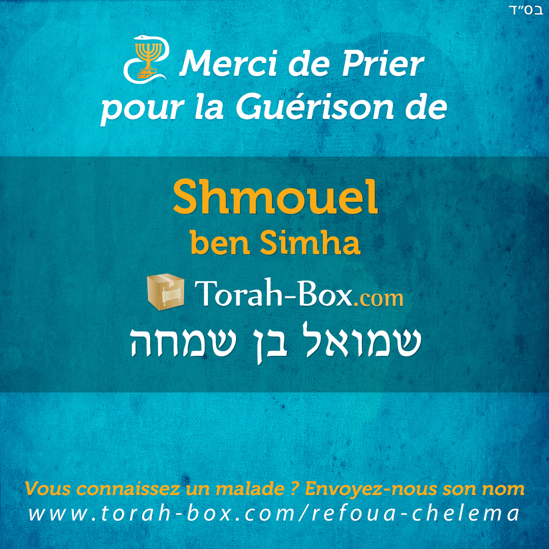 Nos Sages ont enseigné que la Téfila (prière), la Téchouva (repentir) et la Tsédaka (charité) permettent d'annuler un décret divin. Afin de contribuer à la guérison complète de Shmouel, ses proches et ses amis sont invités à agir pour lui.