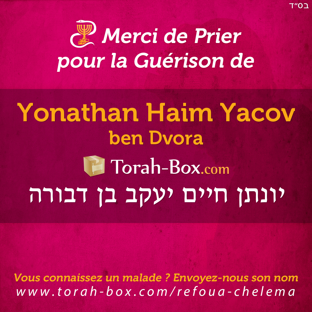 Nos Sages ont enseigné que la Téfila (prière), la Téchouva (repentir) et la Tsédaka (charité) permettent d'annuler un décret divin. Afin de contribuer à la guérison complète de Yonathan Haim Yacov, ses proches et ses amis sont invités à agir pour lui.
